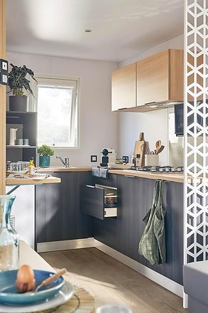 L’originalité de ce mobil-home neuf est la cuisine décalée vers l’arrière qui vous séduira sans aucun doute. Cette disposition permet un espace plus aéré et sépare mieux la cuisine du séjour. Côté équipement, rien ne manque : plaque de cuisson 4 feux, évier inox, plan de travail escamotable, détecteur de fumée, rangements. Le séjour est lui aussi totalement équipé pour des moments de convivialité et de détente.
