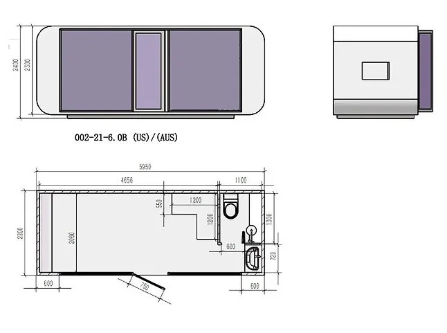 Dimensions de transport : 5 950 x 2 300 x 2 550 mm (L x l x h).